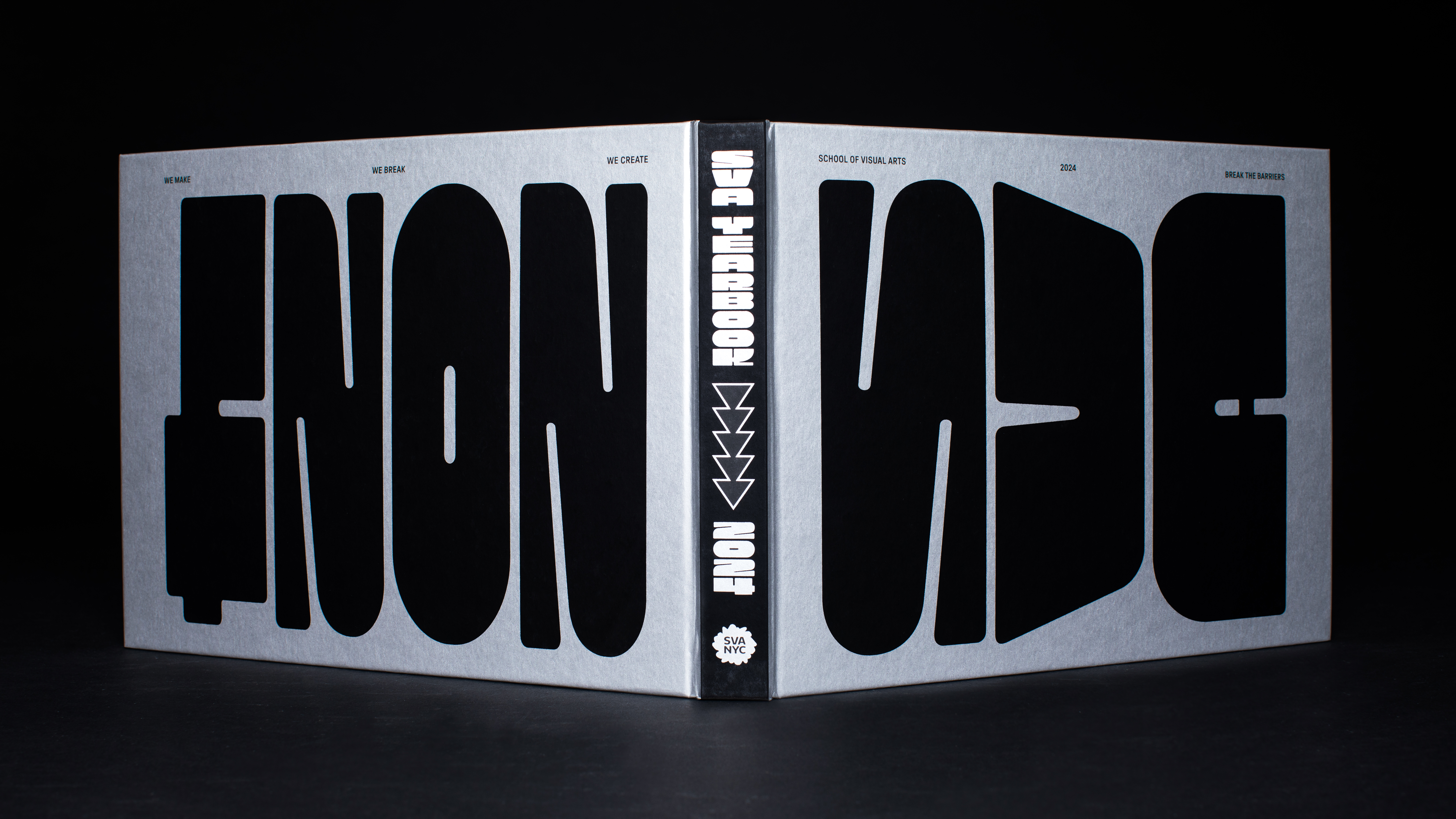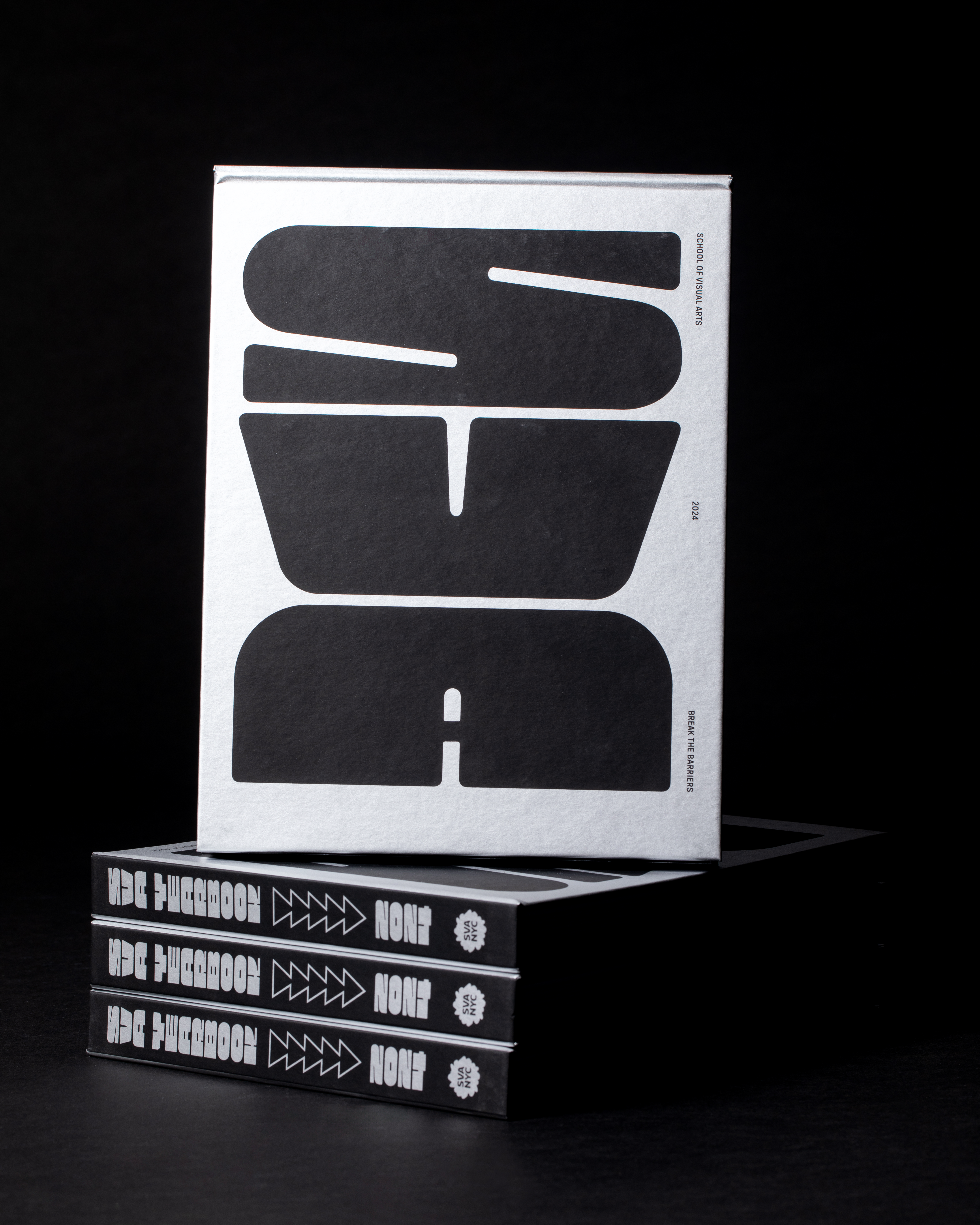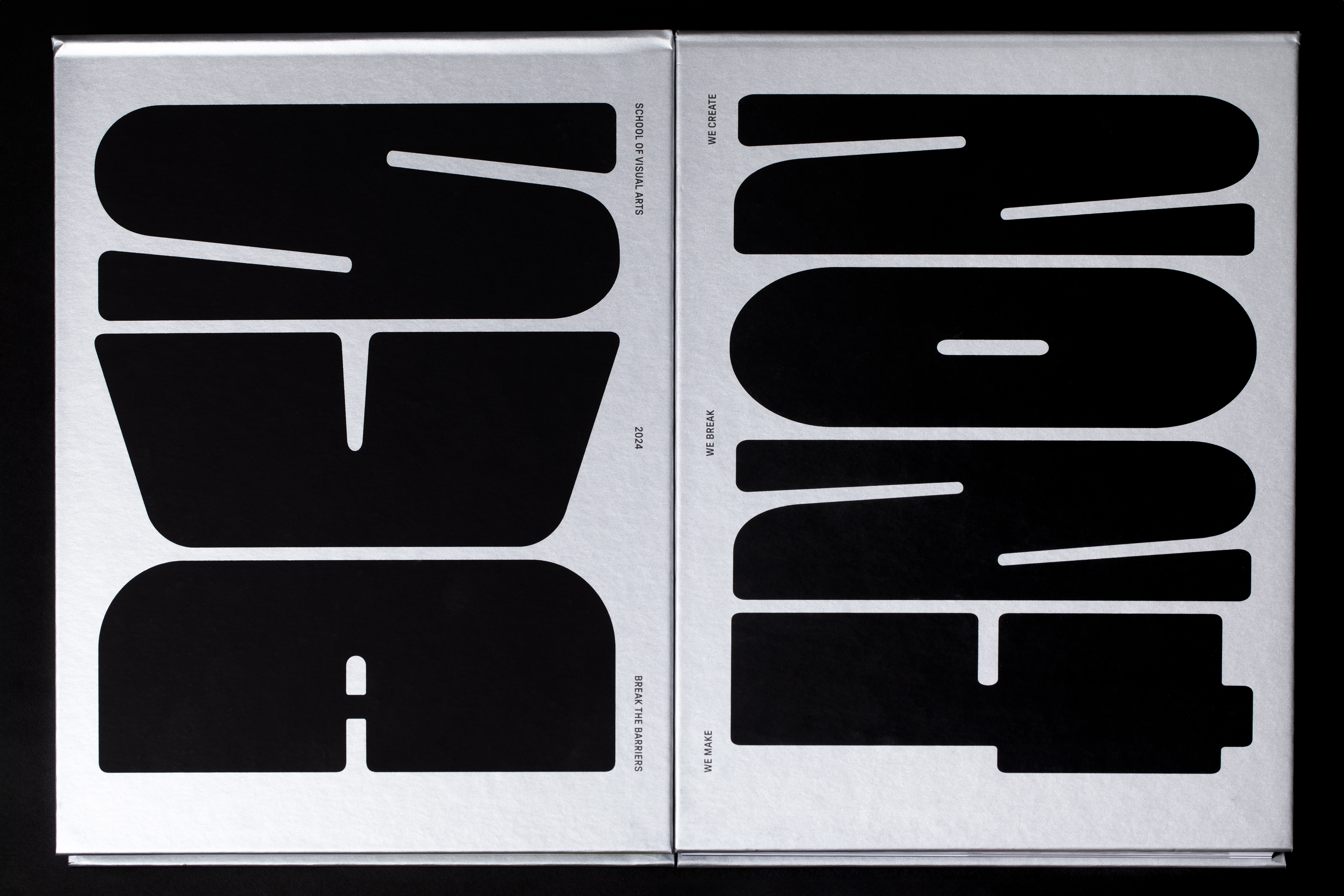 The 2024 School of Visual Arts yearbook theme is “Breaking Boundaries.” The book breaks convention by being in a vertical format and is delivered inside a tear-away cover where you literally have to break open the container via a pull-strip to reveal the actual book. The book also features a custom variable typeface, Panta Rhei (meaning always in flux) with dramatically extended proportions and very small counter spaces.